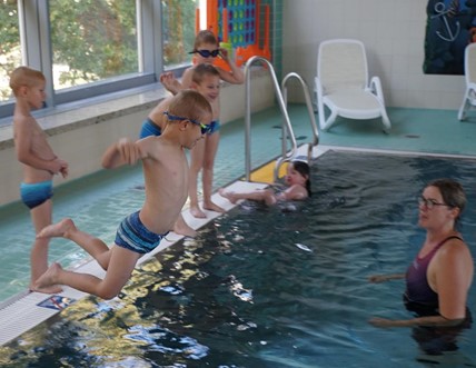 Gleich nebenan üben die „neuen“ Wale ebenfalls die richtige Fußhaltung beim Brustbeineschwimmen.