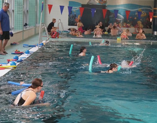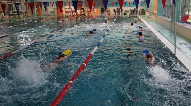 42 Kinder versammeln sich an der Längsseite, unsere zwei „Kleinsten“ vorn am Becken.